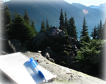W – Jillian and I are oceanside, up on a ridge, plenty of view through tall evergreens, great sun, finally warm and the oxygen is amazing.